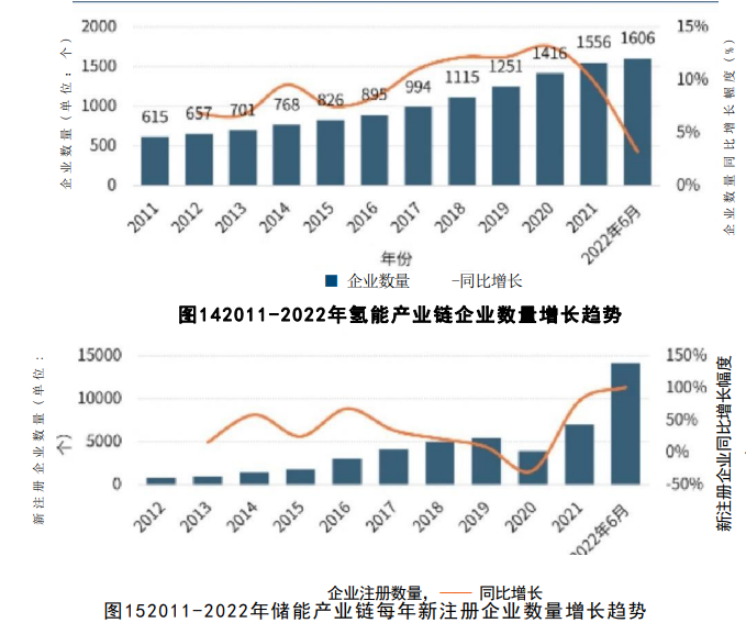 在氢能企业中,15家企业主要从事氢燃料电池等车用场景下的氢能产品研发制造,5家企业布局氢能全链条装备制造业务;在储能企业中,8家企业核心产品在于储能系统集成及相关解决方案,6家企业从事多种类型储能设备的制造。