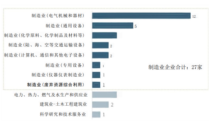 33家上市公司中,27家同属制造业,其中电气机械和器材制造企业12家,通用设备制造企业5家,化学原料和化学制品制造企业3家,计算机、通信和其他电子设备制造企业2家,陆、海、空等交通运输设备制造企业2家,废弃资源综合利用、仪器仪表、专用设备等制造企业分别有1家;除制造业企业以外,还有2家公用事业公司、2家建筑业公司、1家专业技术服务类公司。