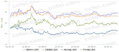 整体来看,终端需求较2022年有所改善,带动化纤直接下游需求好于2022年同期。从化纤下游主要行业(加弹、织机、涤纱)开机率来看,均处于近几年的偏高水平。从轻纺城成交量来看,也略好于2022年同期,特别是9月份之后成交量明显提升。