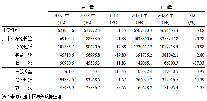 表2 2023年化纤主要产品进出口情况