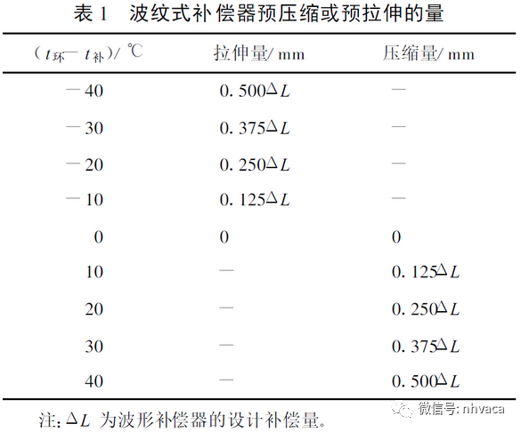 波纹式补偿器安装时,应根据补偿零点温度(t补)定位,补偿零点温度就是在管道设计时考虑达到的最高和最低温度的中点。当环境温度(t 环)等于补偿零点温度时安装,可不进行预拉伸或预压缩;当环境温度高于补偿零点温度时安装,应进行预压缩;当环境温度低于补偿零点温度时安装,应进行预拉伸。预拉伸或预压缩的数值见表1。