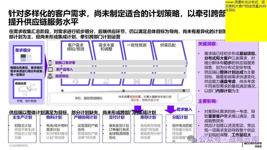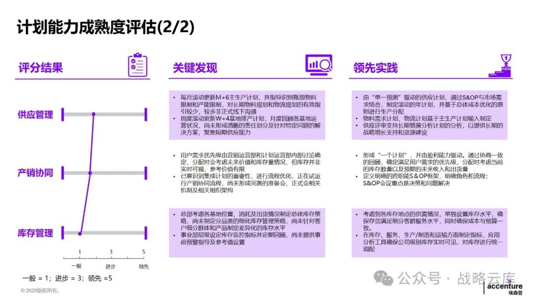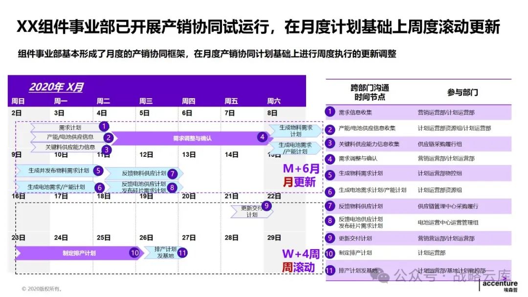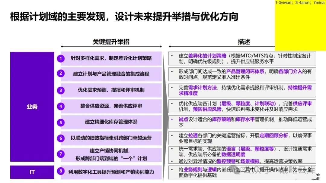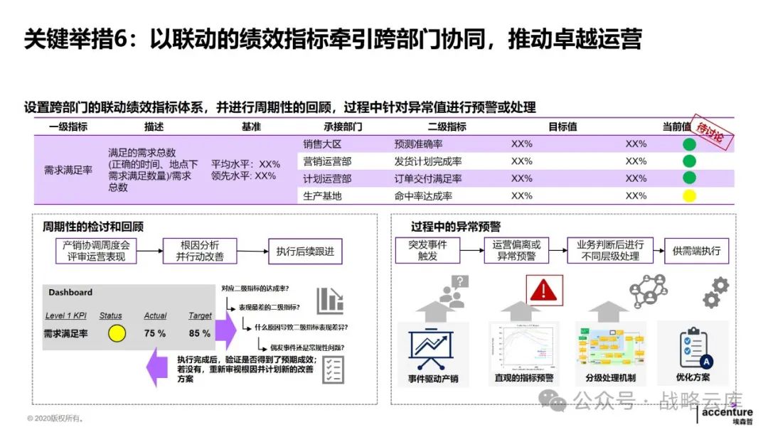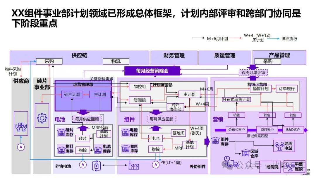制定差异化的计划策略:根据不同的生产和库存特点,制定适应的主生产计划和基地排产计划,同时明确各类计划的优先级规则,以提升供应链服务水平。 建立一致的产品管理闭环体系:各部门需要达成一致,明确各阶段的介入时间和准入准出条件,形成完整的产品管理闭环。 优化需求计划方法:持续完善需求提报和评审机制,提高需求精准度,以更好地满足客户需求。 优化供应端计划:通过完善供应评审机制,预防供应风险,快速响应需求变化。 设计适当的库存策略和库存水平管理机制:通过试点,推动降低运营成本,提高库存管理效率。 建立关键运营指标:统一各部门的语言和数据透明度,通过定期回顾分析,确保事业部目标的实现。 监控异常情况:通过监控预警和场景模拟,提高运营决策效率,提升整体运营效率。