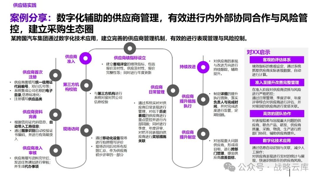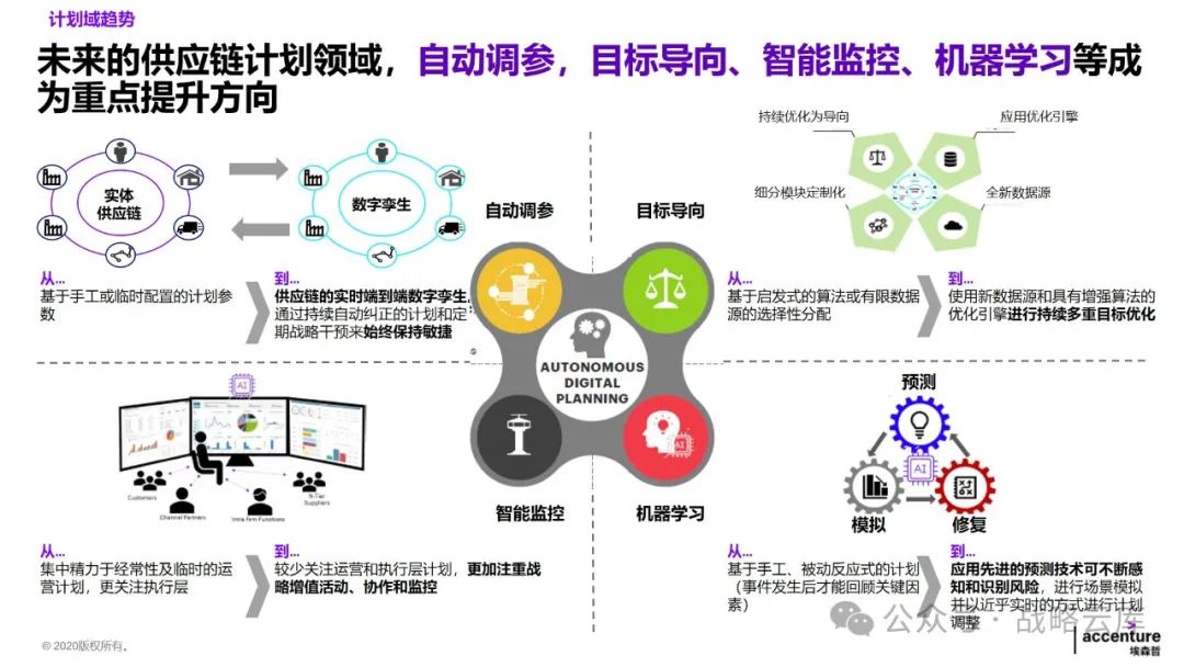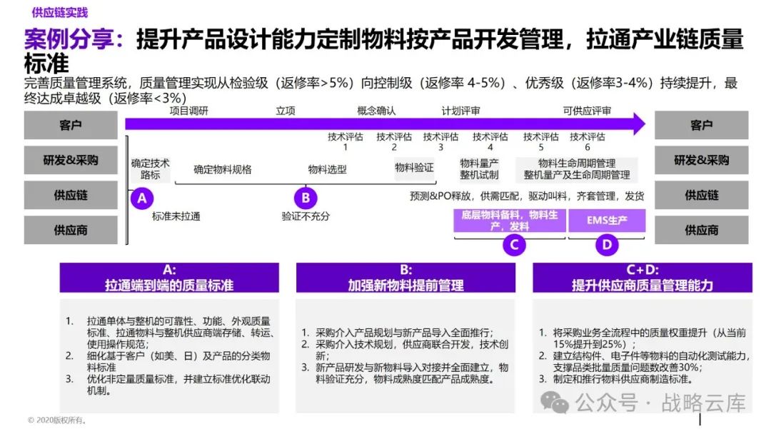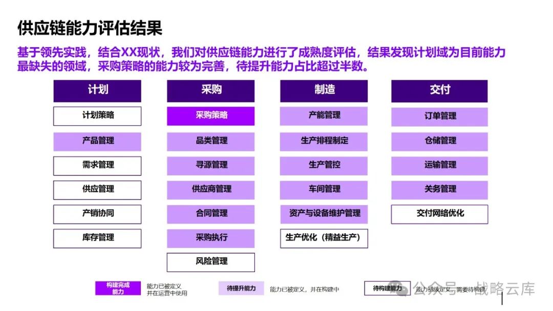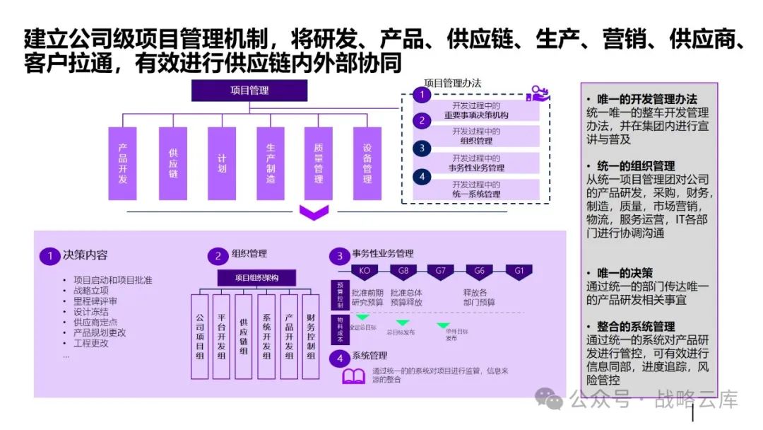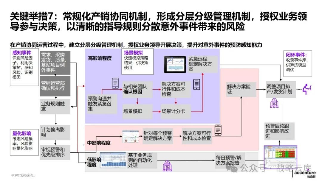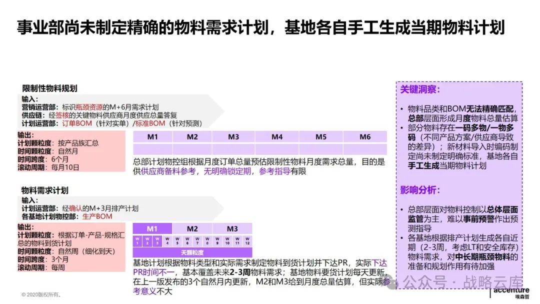 制定差异化的计划策略:根据不同的生产和库存特点,制定适应的主生产计划和基地排产计划,同时明确各类计划的优先级规则,以提升供应链服务水平。 建立一致的产品管理闭环体系:各部门需要达成一致,明确各阶段的介入时间和准入准出条件,形成完整的产品管理闭环。 优化需求计划方法:持续完善需求提报和评审机制,提高需求精准度,以更好地满足客户需求。 优化供应端计划:通过完善供应评审机制,预防供应风险,快速响应需求变化。 设计适当的库存策略和库存水平管理机制:通过试点,推动降低运营成本,提高库存管理效率。 建立关键运营指标:统一各部门的语言和数据透明度,通过定期回顾分析,确保事业部目标的实现。 监控异常情况:通过监控预警和场景模拟,提高运营决策效率,提升整体运营效率。