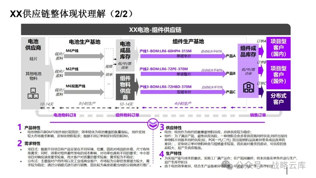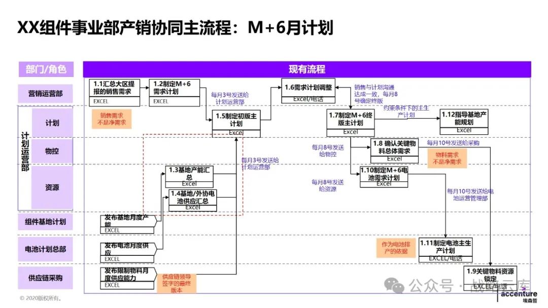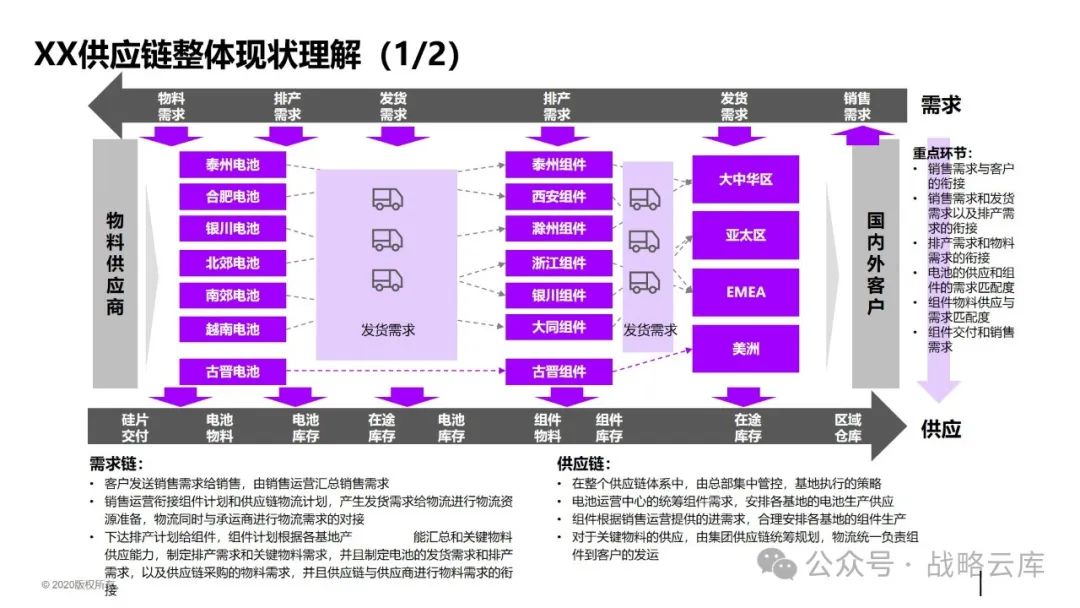 首先,销售部门接收客户的销售需求,并进行汇总和分析。 然后,销售运营部门与组件计划和供应链物流计划对接,生成发货需求并传达给物流部门。物流部门负责准备物流资源,并与承运商进行物流需求的对接。 接着,销售运营部门将排产计划下达给组件计划部门,该部门根据各基地的产能和关键物料的供应能力,制定排产需求和关键物料需求,同时制定电池的发货需求和排产需求,以及供应链采购的物料需求。在这一过程中,供应链部门与供应商进行物料需求的衔接。