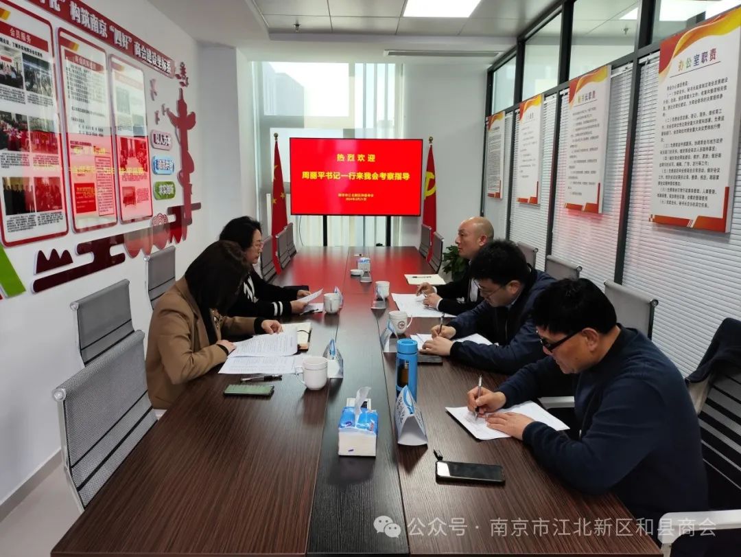 为对非盈利社会组织的党建工作开展情况进行全面深入的了解,指导商会党建工作合规开展。2024年3月21日下午,江北新区工商联党组书记、副主席周丽平与江北新区工商联副秘书长马跃敏莅临我会考察指导,参加接待的人员有:潘仁俊(会长)、黄彪(秘书长)、张训华(常务秘书长)、刘瑾悦(办公室人员)。
