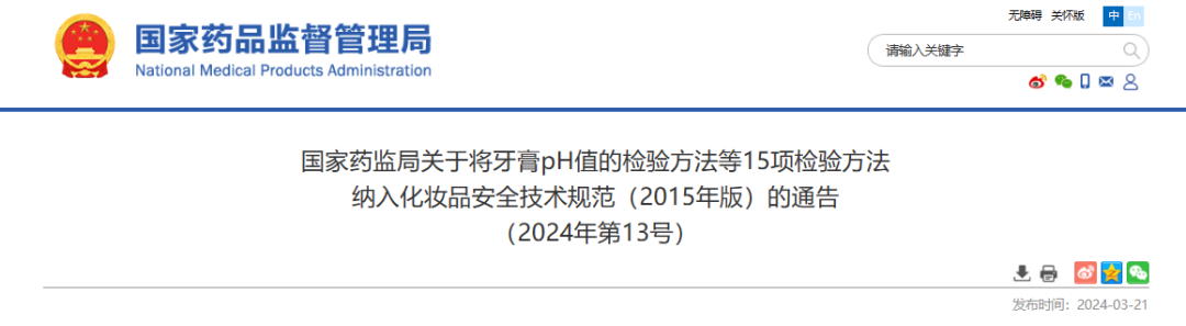 《牙膏pH值的检验方法》等15项检验方法(详见附件2-16)为新增的牙膏检验方法,纳入《化妆品安全技术规范(2015年版)》(详见附件1),自2024年12月1日起,牙膏注册、备案及抽样检验相关检验应当采用本通告发布的检验方法。