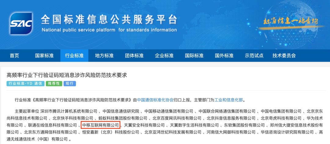 近日,中移互联网有限公司(以下简称"中移互联网" )参与起草的行业标准《高频率行业下行验证码短消息涉诈风险防范技术要求》由工业和信息化部批准发布,并将于2024年4月1日起正式实施。该文件中规定了互联网信息服务提供商高频率下行验证码短消息风险防范技术要求,提出了安全防护机制分层架构和安全防护要求,适用于互联网信息服务提供商规范下发验证码短消息流程,也适用于行业主管部门、第三方评估机构等对互联网信息服务提供商下发验证码短消息接口的安全防护能力进行监督、管理和评估。
