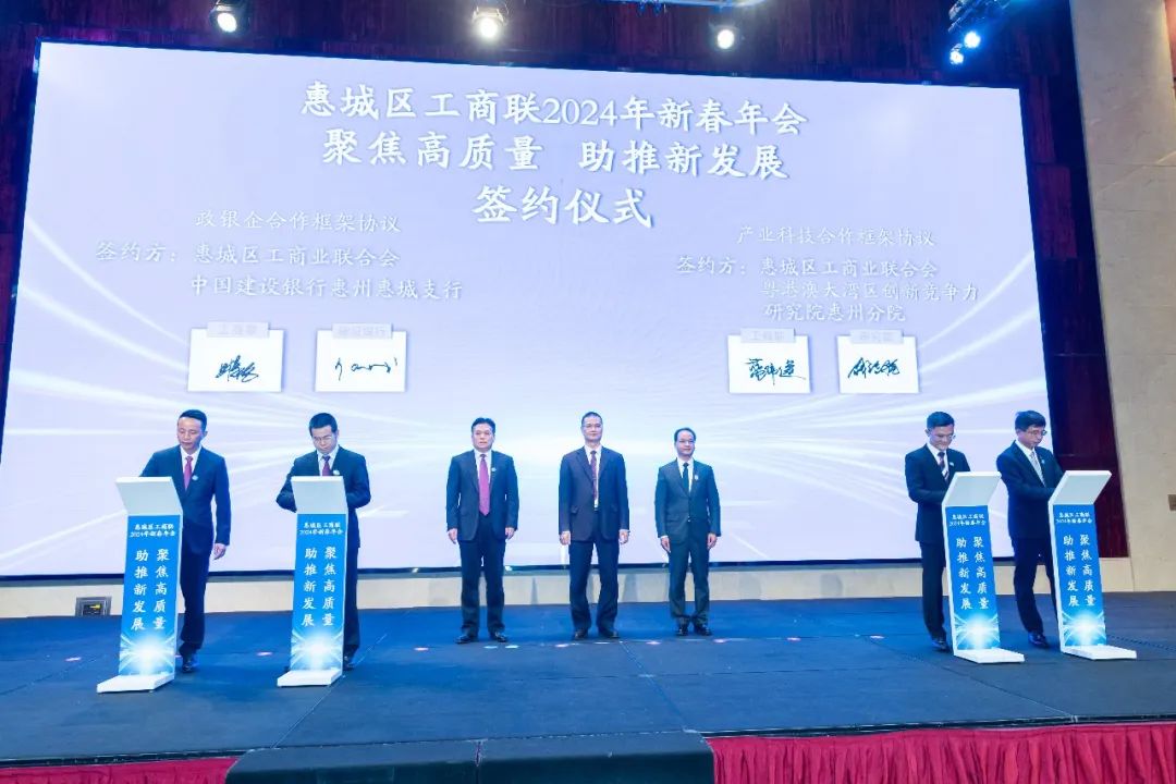 会议还举行了产业科技合作和政银企合作签约仪式,区工商联分别与粤港澳大湾区创新竞争力研究院惠州分院、中国建设银行惠州惠城支行签订了合作框架协议,搭建了产业科技互促、金融服务企业发展的桥梁,因地制宜培育发展新质生产力。本着平等合作、优势互补、共同发展的原则,就在惠州市惠城区区域合作开展高端智库助力惠城区中小企业发展业务,与区工商联达成产业科技赋能与升级、企业高端服务需求、课题规划与企业咨询、技术创新与研发支持、企业管理与人才培养等合作内容,我院数字化研究中心首席专家钱治航代表我院签约,钟绍伟院长上台见证此次的签约仪式。
