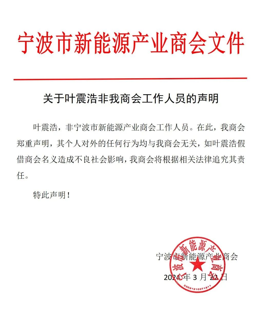 【声明】关于叶震浩非我商会工作人员的声明