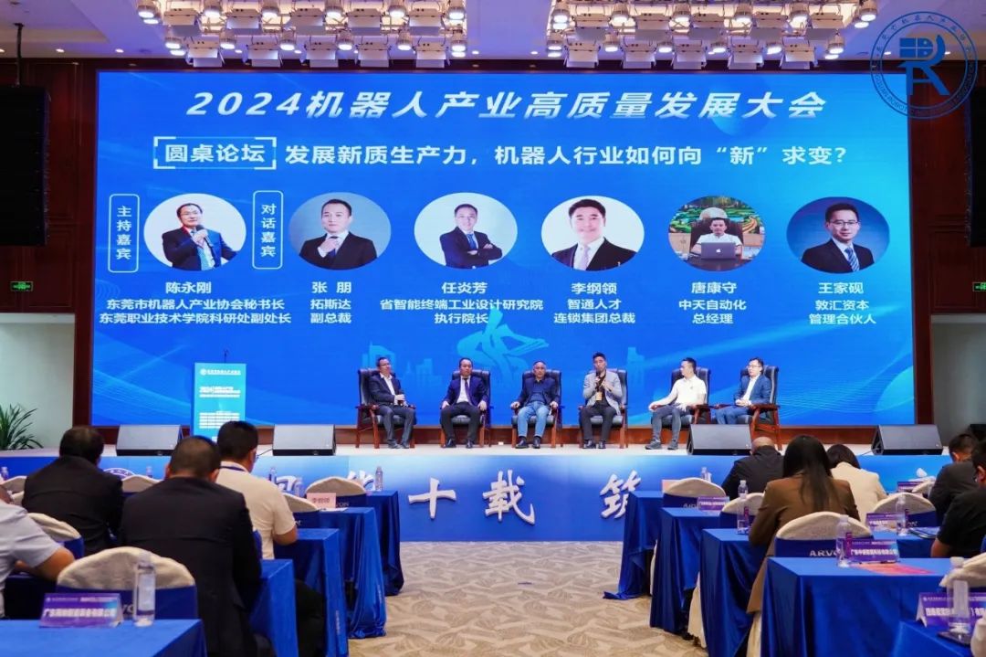 本环节由东莞市机器人产业协会秘书长、东莞职业技术学院科研处副处长陈永刚博士主持,并邀请广东拓斯达科技股份有限公司副总裁张朋、广东省智能终端工业设计研究院执行院长任炎芳、智通人才连锁集团总裁李纲领、东莞市中天自动化科技有限公司总经理唐康守、敦汇资本管理合伙人王家砚出席对话环节,就发展新质生产力的热点话题,探讨机器人行业如何向“新”求变。