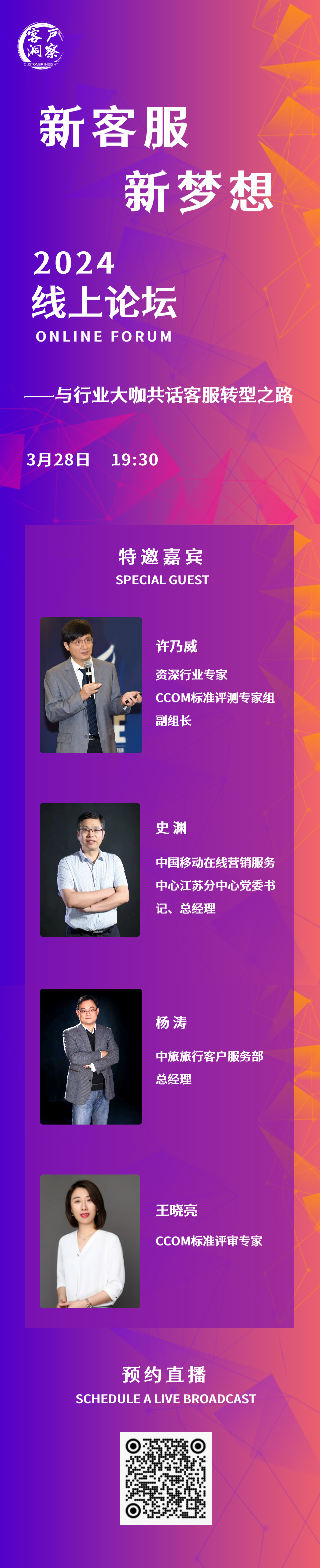 2024年的新客服节活动定于4月25日至26日在清远盛大举行。届时,我们将邀请业内同仁齐聚一堂,共同探讨行业的未来发展趋势。与此同时,为了进一步深化此次盛会的意义,拓展“客服转型”的内涵,客户洞察将于3月28日晚7点半,邀请到行业大咖做客直播间,深入探讨“客服转型”这一核心议题。