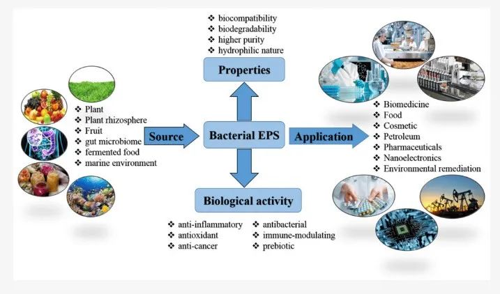 胞外多糖(Exopolysaccharide,EPS)是一类由某些微生物在生长代谢过程中分泌到细胞壁外的次级代谢产物,一般由重复的糖单元或多糖衍生物组成。根据与菌体细胞的依附关系,可将EPS分为荚膜多糖和粘液多糖。EPS不仅可以作为稳定剂、增稠剂、乳化剂和胶凝剂,改善发酵食品的外观、流变性能、口感和质地,而且还具有抗氧化、抗菌、降胆固醇、免疫调节、抗肿瘤、抗凝血,甚至抗病毒活性。本期咨询主要介绍乳酸菌胞外多糖在健康食品领域中应用。