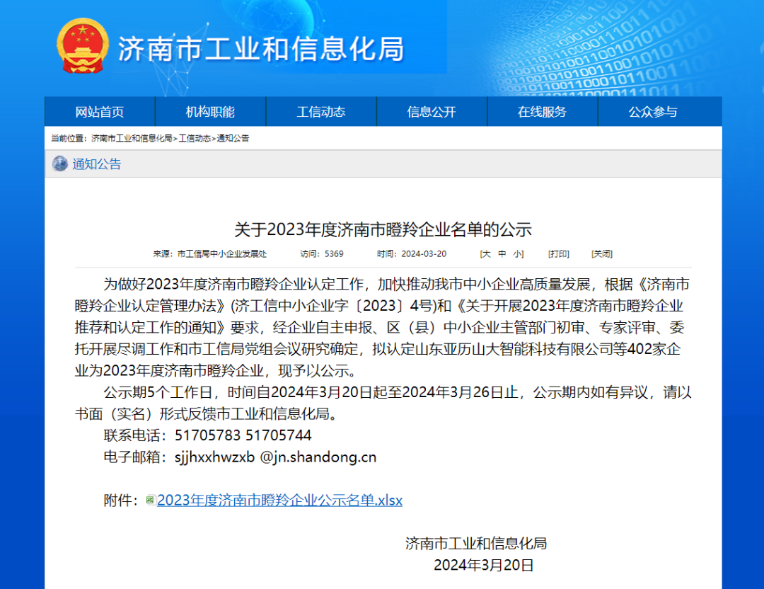3月20日,济南市工业和信息化局发布《关于2023年度济南市瞪羚企业名单的公示》,经企业自主申报、区(县)中小企业主管部门初审、专家评审、委托开展尽调工作和市工信局党组会议研究确定,拟认定济南左右动画设计有限公司等402家企业为2023年度济南市瞪羚企业。