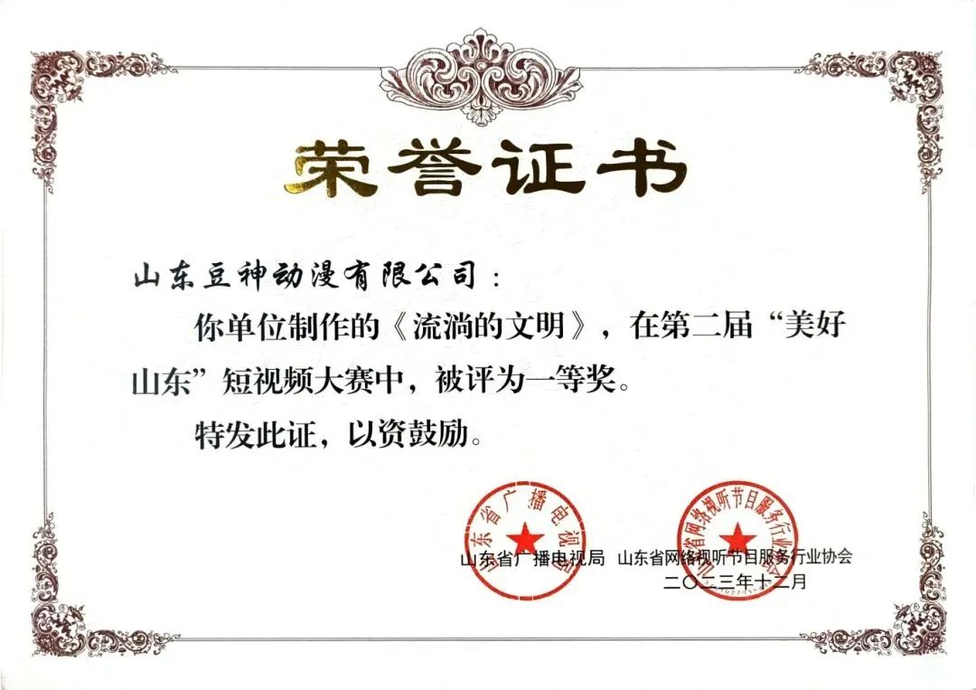 近日,山东省广播电视局将第二届“美好山东”短视频大赛《流淌的文明》一等奖荣誉证书递送至豆神动漫。这不仅是对《流淌的文明》作品品质的高度认可,更是对豆神动漫持续深耕文化创意产业、用数字技术传承与发展中华文明精神标识和文化精髓的有力肯定。