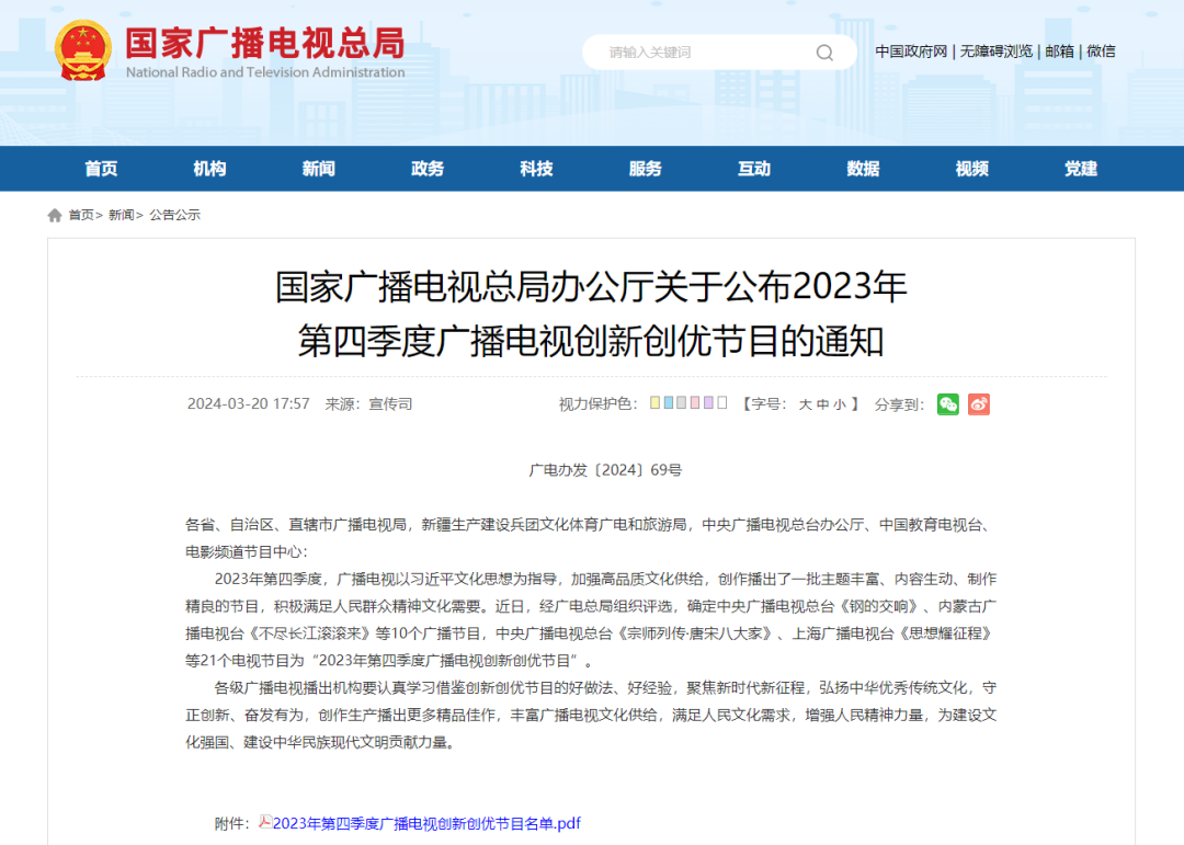 广电总局关于公布2023年第四季度广播电视创新创优节目的通知