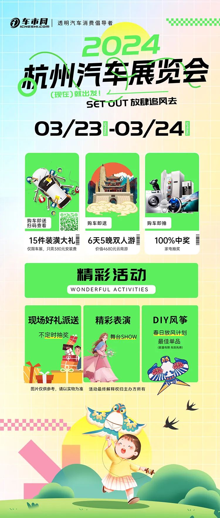 本届车展将春日风筝元素融入车展,快来放飞春天,感受轻盈飘逸的春日气息。车模亮眼,走秀加持现场气氛,嗨爆!现场还有DIY互动,福利奖品免费送!汽车展位羊毛不要太多,一场丰富且趣味十足的车展活动,你确定不来吗?