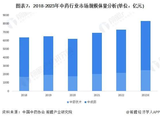 中药行业中游主要是中成药及中药饮片。据中国中药协会数据,2018-2022 年,我国中药行业规模整体呈波动增长态势,从 2018 年的 6370 亿元增长至 2022 年的超过 7000 亿元。据中国中药协会数据,2023 年,中国 75 家中药上市企业营收同比增长 14.3%,根据 2023 年中国中药市场现状,下半年或将延续上半年增速,前瞻初步测算,2023 年,中国中药行业规模或将达 8332 亿元。