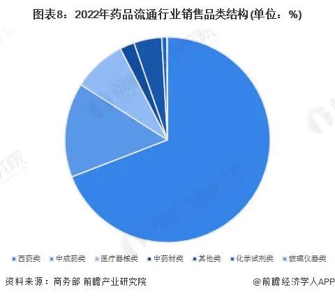 据商务部发布的《2022 年药品流通行业运行统计分析报告》。按销售品类分类,西药类销售居主导地位,销售额占七大类医药商品销售总额的 69.2%,其次,中成药类占 14.9%,中药材类占 2.3%。