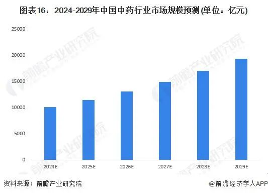 综上所述,未来中国中药行业发展潜力较大,前瞻预计 2024-2029 年,中国中药行业将以 14% 的年复合增速增长,预计 2029 年中国中药行业规模将达接近 2 万亿元。