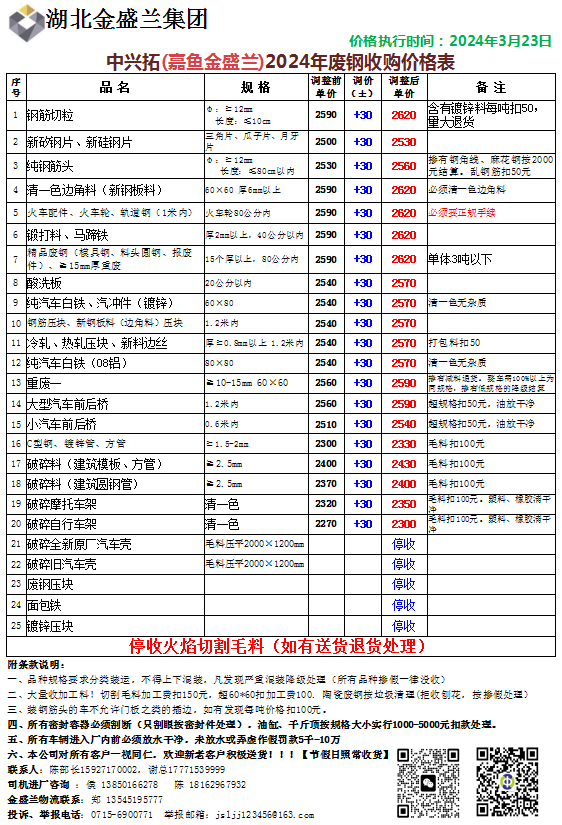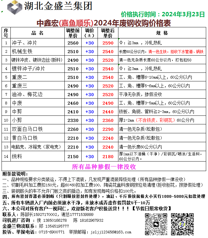 【金盛兰集团嘉鱼公司】3月23日起废钢采购价