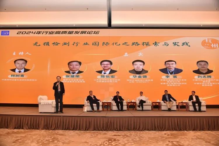 在访谈环节,以“无损检测行业国际化之路探索与实践”为专题,特邀中国特检院原院长林树青担任主持,总局特种设备安全监察局原一级巡视员张建荣等5人担任对话嘉宾,从海外企业注册、海外国家政策、地缘政治风险、经营风险、企业及人员资质要求、员工本土化及风险、器材通关政策、国外先进技术装备和理念等方面进行了深入的交流和探讨,并结合国内检测机构现状,对国内机构走出国外的形势进行了分析,提出了检测机构要想走出国门,必须解决小、散、乱和低价、无序竞争状态,走技术创新、智能化、智慧化高质量发展之路。