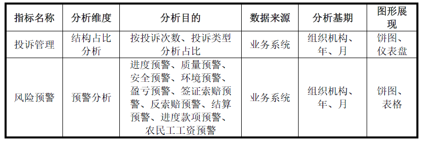 根据管理平台对项目各项指标进行分析,及时对质量、安全、进度等各项指标进行风险预警。