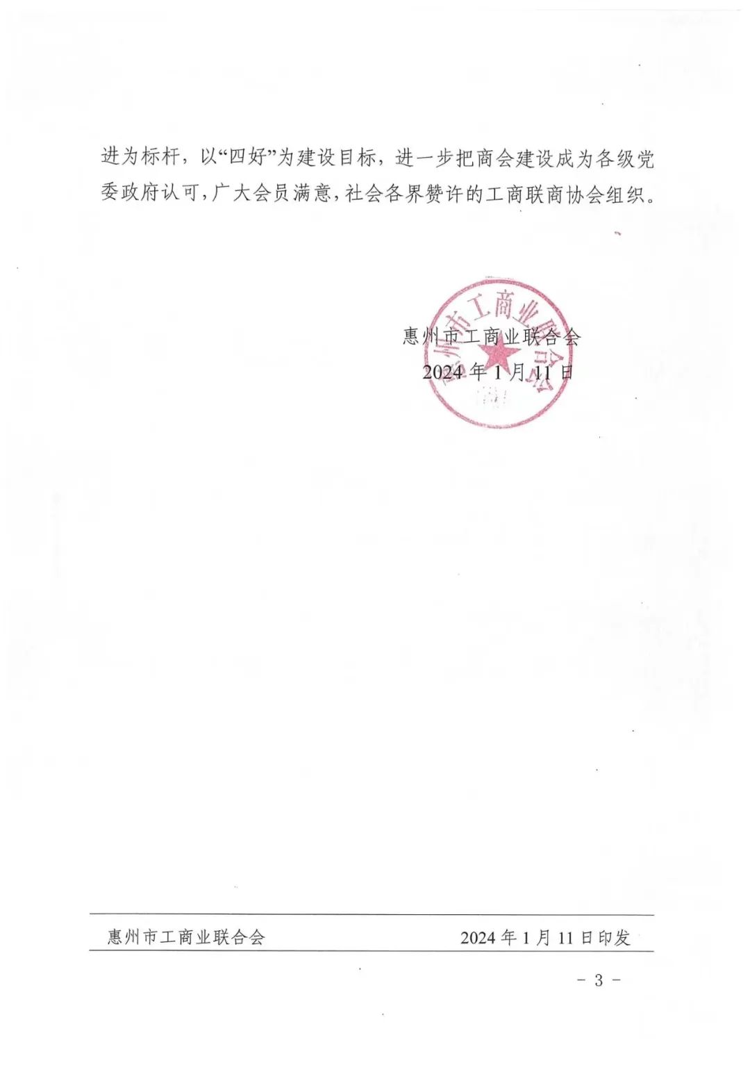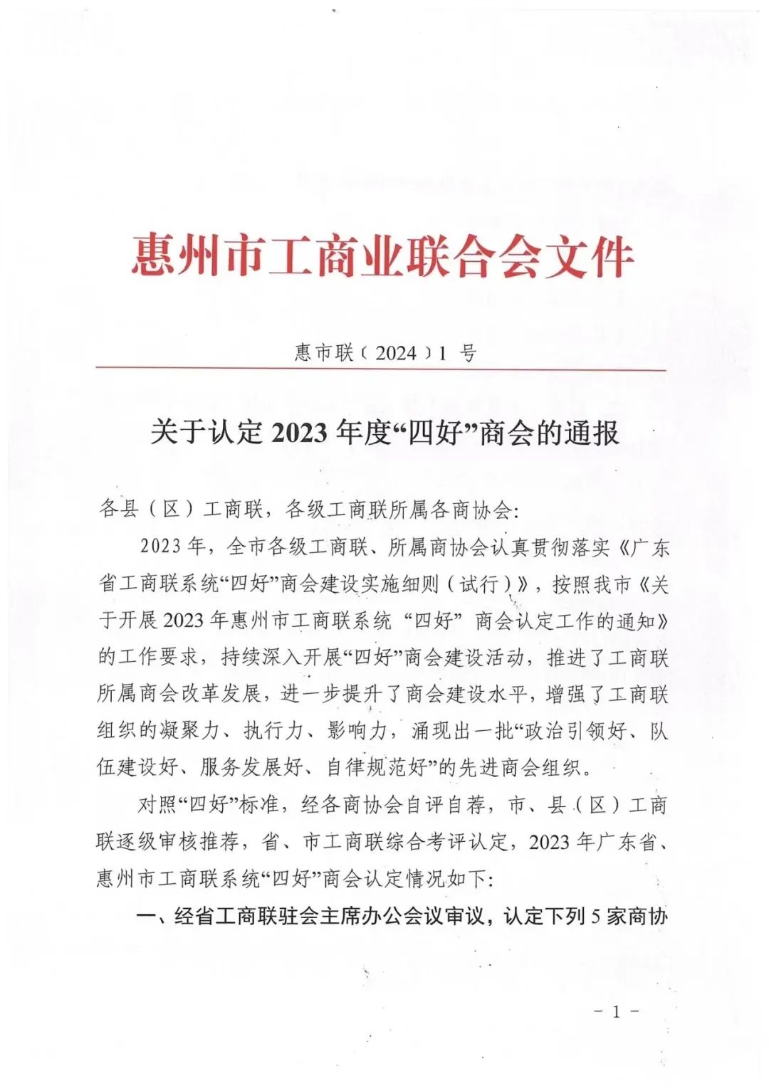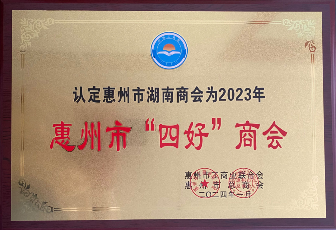 荣获“2023年度惠州市‘四好'商会”荣誉称号,是对我会在过去一年里所取得的众多成绩和贡献的高度肯定。