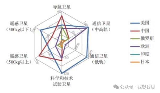 在轨航天器方面,截至 2022 年底,全球在轨航天器数量达 7218 个,其中美国在轨航天器总数达 4731 个,占全球总数的 65.5%;欧洲在轨航天器总数达 1002 个,位居世界第二;中国在轨航天器数量达 704 个,首次超过 700 个。同时,从在轨航天器分布领域来看,美欧高轨通信卫星数量全球领先,美国低轨通信卫星领跑全球,中国大中型遥感卫星、导航卫星数量位居世界第一。