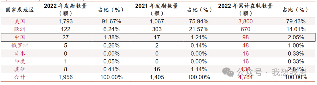 2022 年全球新增发射通信卫星 1956 颗,同比增长 39.22%,其中,受益于“星链”(Starlink)星座 2022 年全年的批量发射,美国通信卫星发射数量快速增长,成为全球通信卫星数量增长的主要驱动力。