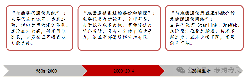 自 20 世纪 80 年代末至今,全球卫星互联网发展已有 30 多年历史,可划分为三个发展阶段。