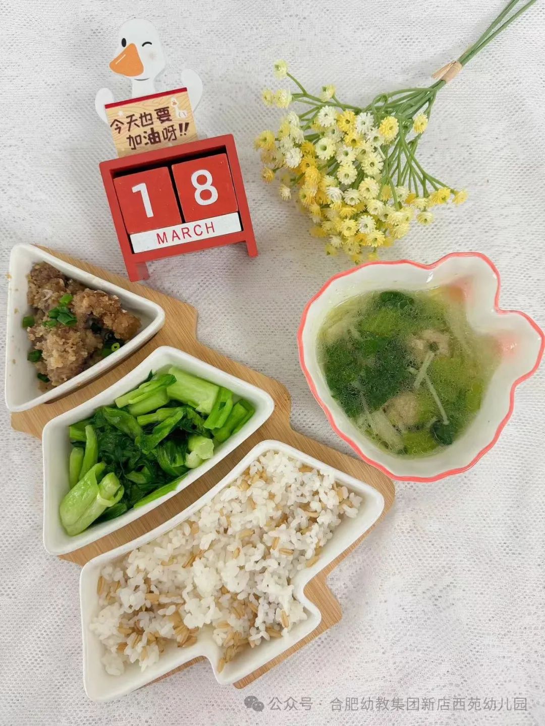 燕麦米饭、米粉蒸肉、清炒菜苔、金针菇青菜肉丸汤