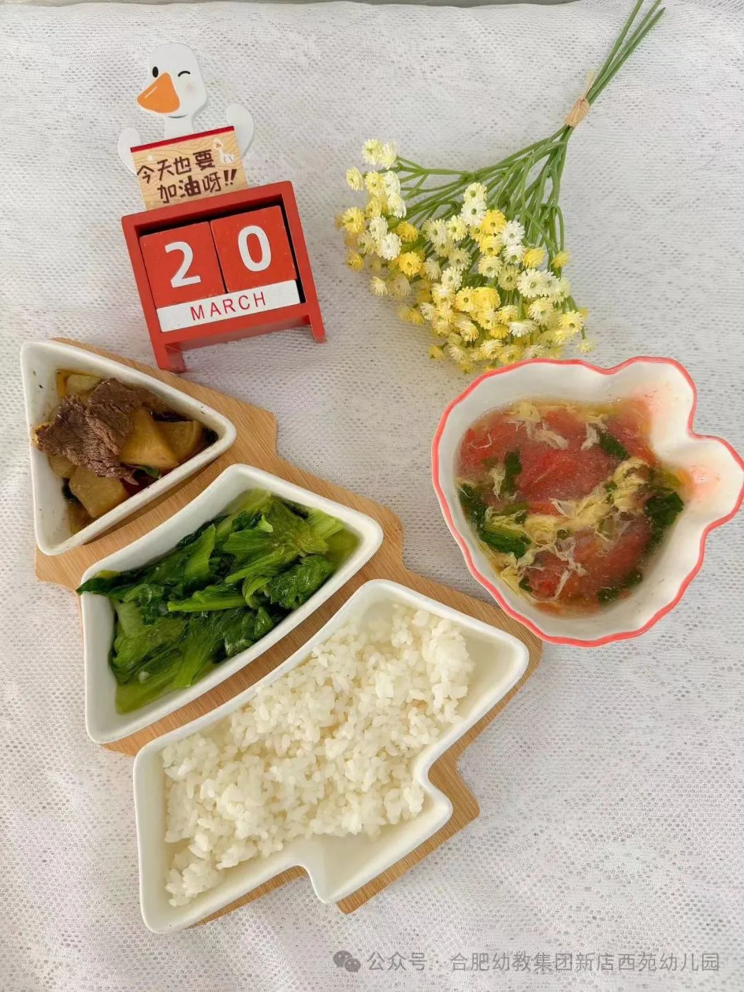 香米饭、牛肉炖萝卜、蒜蓉生菜、番茄猪肝蛋花汤