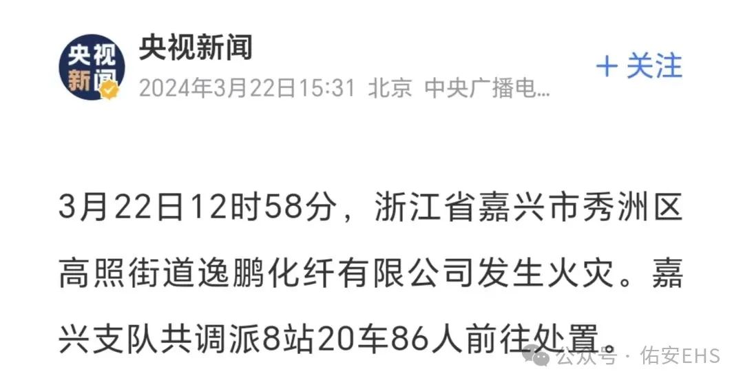 3月22日12时58分,浙江省嘉兴市秀洲区高照街道逸鹏化纤有限公司发生火灾。嘉兴支队共调派8站20车86人前往处置。