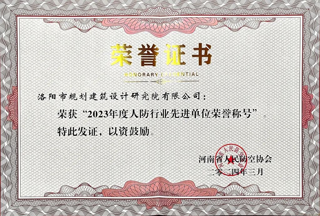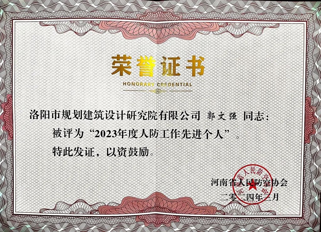 2024年3月15日,河南省人防协会第四届二次会员大会在郑州成功召开。会议旨在促进河南省人防事业的高质量全面发展,推进会员单位间加强交流,也为了建立更好的战略型、全面型、服务型平台。大会表彰了先进单位和先进个人,洛阳市规划建筑设计研究院有限公司荣获河南省人民防空协会“2023年度人防行业先进单位”荣誉称号,郭文强同志获“2023年度人防工作先进个人”荣誉称号。