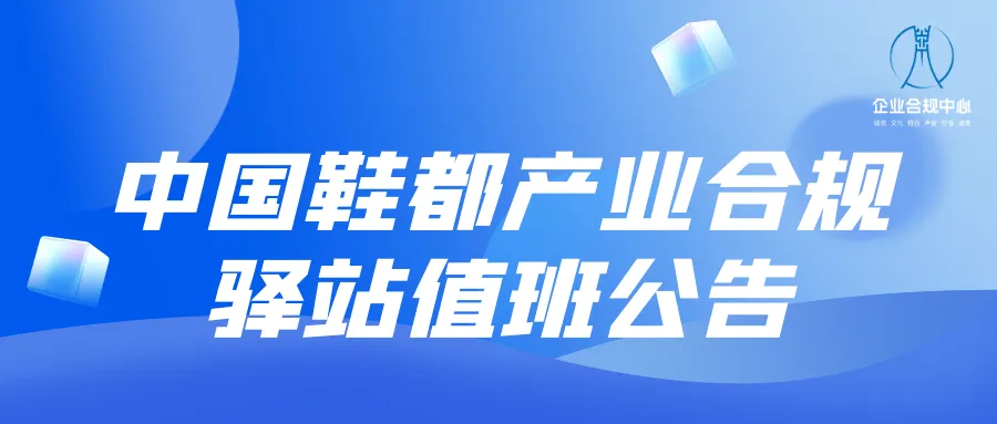 为推动企业行政合规体系建设,实质性发挥优化法治营商环境作用,为企业发展提供更优法治服务,创造更好的法治环境,鹿城区中国鞋都产业合规驿站实行值班制,现将值班事项公告如下: