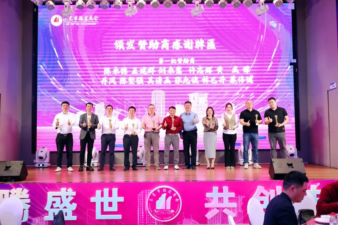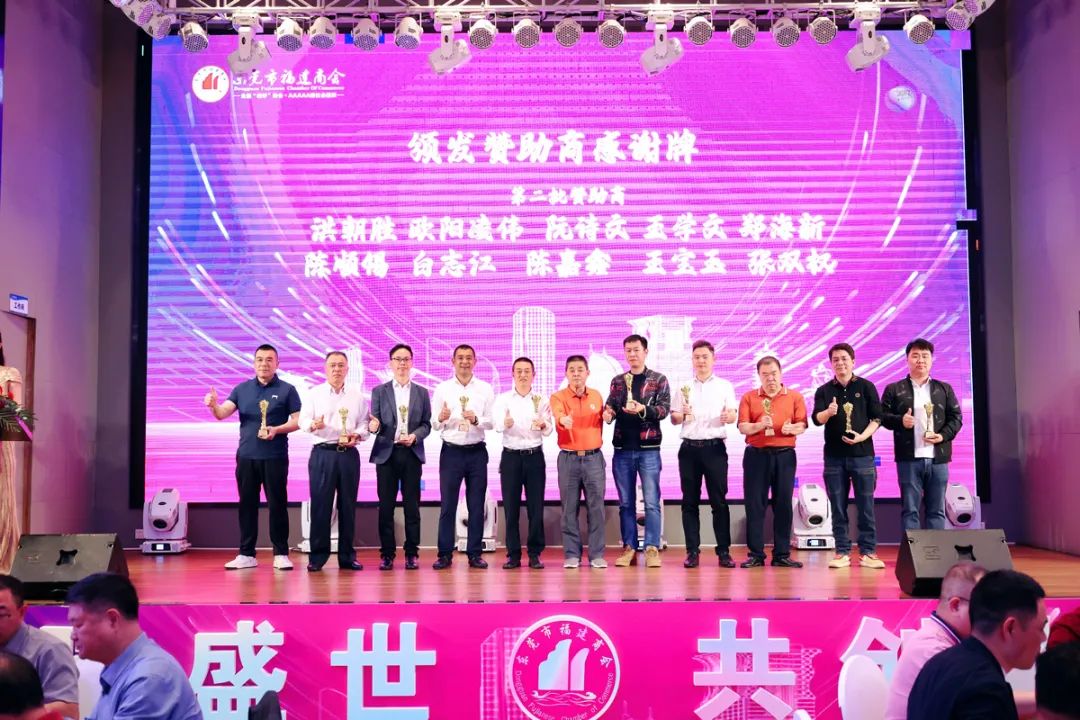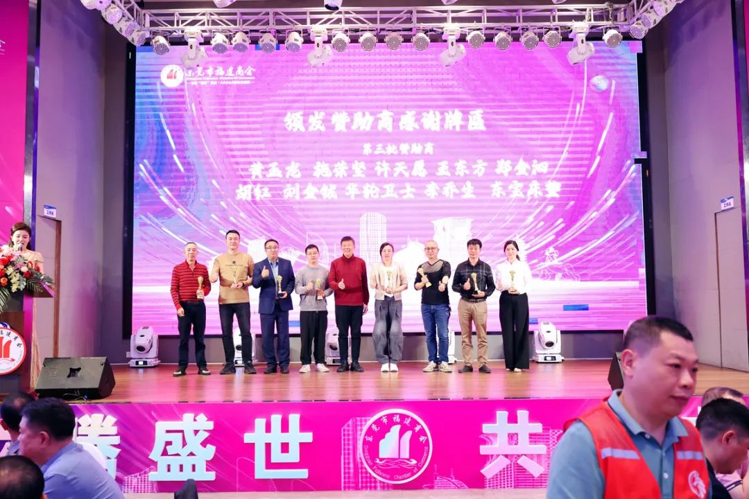 △图为东莞市福建商会高级顾问郑国钦为赞助本次新春团拜会的爱心企业家颁发感谢牌匾。