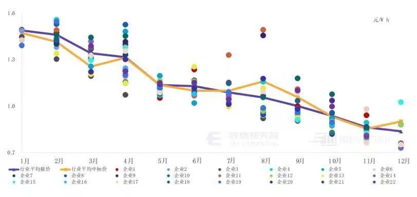 众多的参与方和激烈的市场竞争,使得企业为了获得订单而不得不一再降价。即使在平均价格已经低于1元/Wh的10月至12月,仍有大量企业以低于行业平均水平近0.1元/Wh的价格参与竞争,低于行业平均价10%-20%。