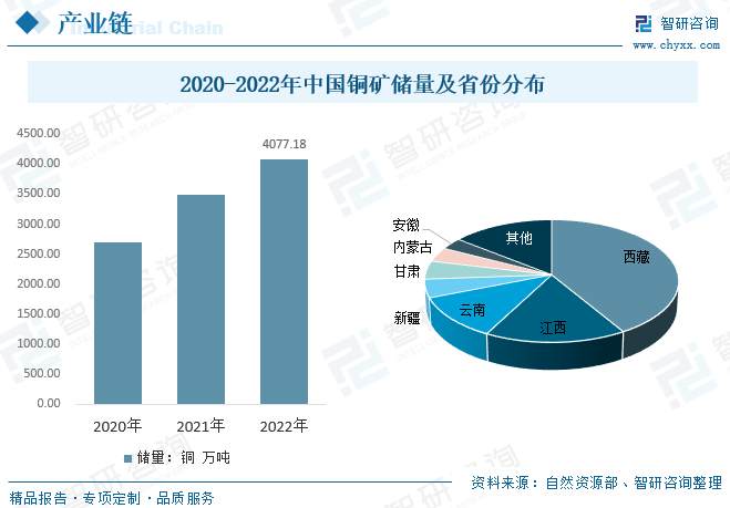 全球铜资源储量总体较为丰富且集中,智利是全球铜储量最大的国家,其次是澳大利亚、秘鲁和俄罗斯,前四国占据全球近一半的铜资源。我国铜资源储量及可开采性欠佳。近年来,中国可开采铜矿资源不断减少,自然资源部数据显示,2022年中国铜矿储量为4077.18万吨,主要分布在江西、新疆、云南和西藏四省,预计可开采年限约40年,此外,我国铜资源在矿床规模、矿石品位和开采难度方面存在劣势。