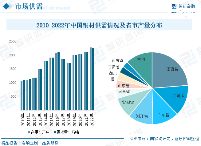 中国铜材行业经过长时间的发展,已经成为全球最大的铜材生产国、贸易国和消费国,铜材的产量和消费量已占世界总量的60%以上,在国际铜加工行业占有重要的产业地位。在生产方面,中国铜材行业竞争日趋激烈,同质化程度较高,导致产能过剩,一定程度上影响了国内铜材产量,导致我国铜材在2017-2018年期间铜材产量有所下降,随着新能源和电力等领域持续扩张发展,整体铜材需求增长明显,数据显示,2022年我国铜材产量增长至2286.5万吨,较2021年上涨163万吨,其中江西、江苏、广东和浙江等省份产量占比较高,其中江西省铜材产量542.41万吨,占比全国铜材产量23.7%,2022年我国铜材需求量为2262.1万吨,较2021年增长148.7万吨。