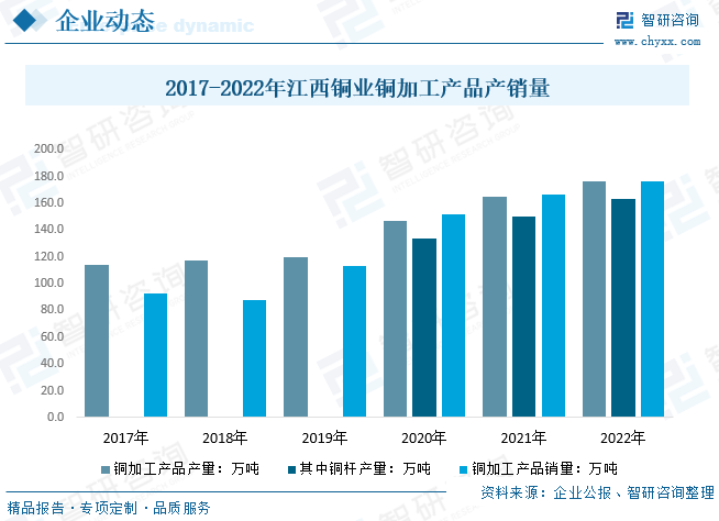 江西铜业主要业务涵盖了铜和黄金的采选、冶炼与加工;稀散金属的提取与加工;硫化工以及金融、贸易等领域,并且在铜以及相关有色金属领域建立了集勘探、采矿、选矿、冶炼、加工于一体的完整产业链,是中国重要的铜、金、银和硫化工生产基地。铜材产销情况而言,光伏、新能源投资强劲,对铜消费拉动明显,江西铜业2022年铜加工材产销量分别为176.74万吨和176.75万吨,其中铜杆产量163.4万吨。