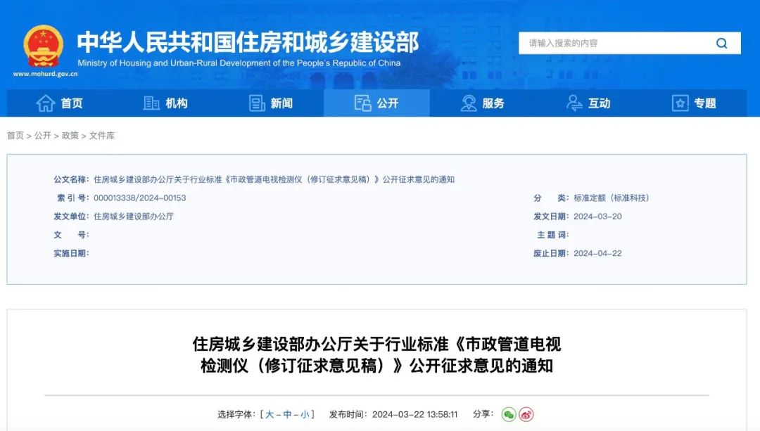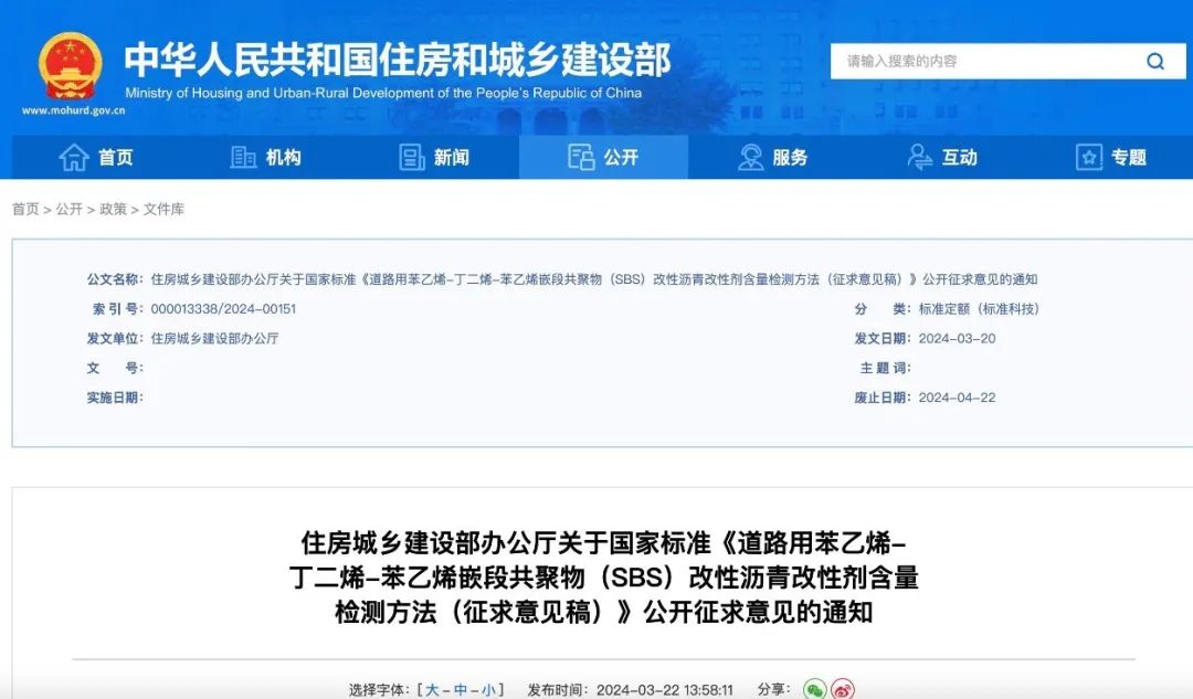 近日,住建部就5项国家标准:《建筑及市政工程混凝土结构自防水技术条件(征求意见稿)》、《道路用苯乙烯-丁二烯-苯乙烯嵌段共聚物(SBS)改性沥青改性剂含量检测方法(征求意见稿)》、《建筑抗震鉴定标准(局部修订征求意见稿)》、《城镇燃气设施运行、维护和抢修安全技术标准(修订征求意见稿)》、《装配式建筑工程施工质量验收标准(征求意见稿)》,1项行业标准:《市政管道电视检测仪(修订征求意见稿)》公开征求意见,意见反馈截止时间为2024年4月22日。