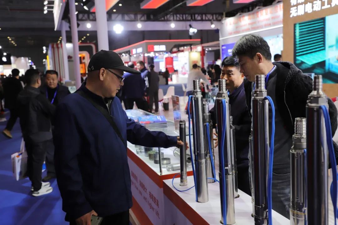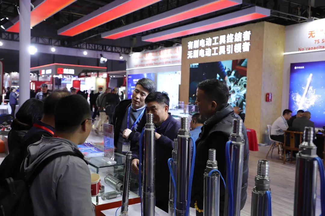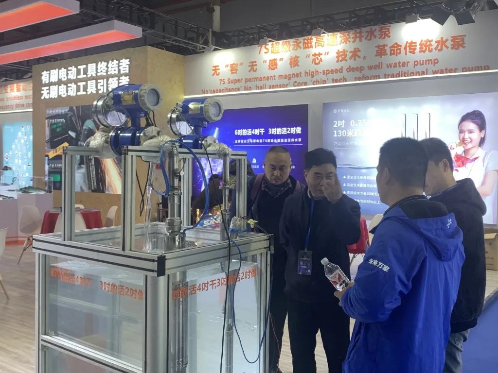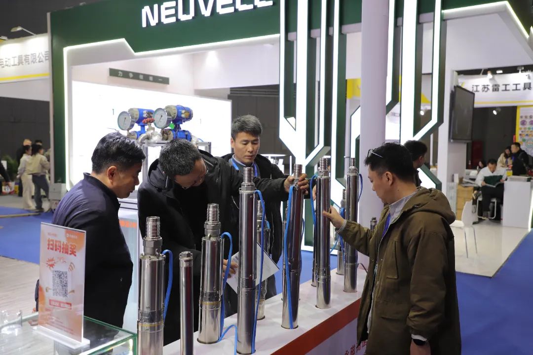 摆在展示区右侧的永磁高速深井水泵,独创的永磁电机+变频控制系统内置式安装结构,重量大小远远小于同品类产品。现场设置水箱装置,观展客商可以零距离体验,结合现场工作人员的专业讲解,体验感直接拉满,收获了一致好评。