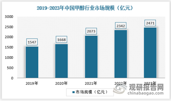 甲醇是一种重要的有机化工原料,可用于生产甲醛、二甲醚、醋酸等化工产品,同时也可以作为燃料和溶剂使用。在中国的化工、燃料和能源等领域,甲醇都有着广泛的应用。随着国内经济的稳步增长和化工、燃料等行业的发展,甲醇市场需求将继续保持增长态势。2023年国内甲醇行业市场规模为2471亿元。