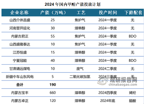 2024年国内预计投放甲醇新增产能970万吨,包括内蒙古宝丰660万吨、内蒙古君正55万吨、河南晋开化工30万吨和宁夏冠能40万吨等。2024年,虽然甲醇新增产能仍然较多,但未来几年上游存量高成本甲醇装置或进入产能清退期,且在严格落实“双碳”政策指引下,国内煤化工新增产能释放比较困难。