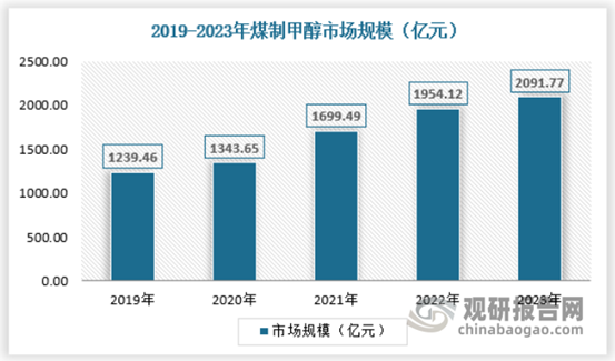 2022 年国家发展和改革委员会、工业和信息化部、生态环境部、国家能源局四部门联合发布《高耗能行业重点领域节能降碳改造升级实施指南( 2022 年版) 》的通知,并附《现代煤化工行业节能降碳改造升级实施指南》,针对煤制甲醇、煤制烯烃和煤制乙二醇提出要求: 到 2025 年,这三个重点行业达到能效标杆水平以上产能比例分别为 30%、50%、30%,基准水平以下产能基本清零,行业节能降碳效果显著,绿色低碳发展能力大幅提高。但一体化项目及焦炉气副产甲醇审批相对顺利,截止2023年国内煤制甲醇行业市场规模约为2091.77亿元,具体如下: