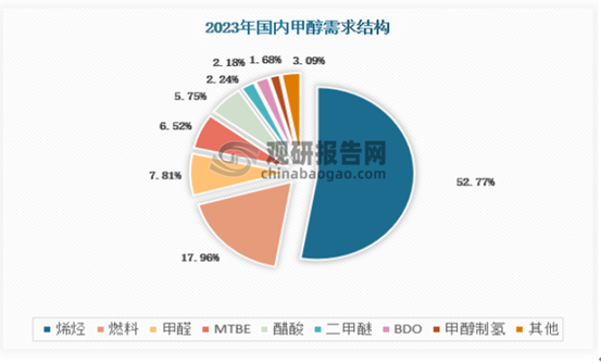 甲醇下游需求分为新兴需求和传统需求,新兴需求指近年来开始发展的烯烃、燃料、制氢和汽油四大类,传统需求包含甲醛和冰醋酸等传统化工品。2023年甲醇需求结构中,烯烃占比高达53%,燃料提升至18%,甲醛、MTBE、冰醋酸和二甲醚合计占比20%。BDO占比首次超过2%。