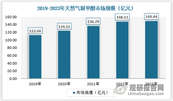 现阶段国内煤制甲醇企业发展情况显著优于天然气制甲醇企业,主要原因为近年甲醇制烯烃及聚烯烃一体化项目提升了甲醇装置开工率,同时也显著改善了煤制甲醇企业的整体利润,促使煤制甲醇企业由基础原料型企业向功能材料企业转型升级。而现阶段多数天然气制甲醇企业仍以外销为主,同时受天然气利用政策限制,其产能规模仍难以与煤制甲醇产能规模相比。2023年国内天然气制甲醇市场规模约为149.44亿元,具体如下: