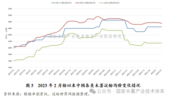 从国内木薯淀粉市场行情来看,本周国内木薯淀粉价格总体稳定。由于近期国内市场需求放缓,库存相对稳定,本周国内木薯淀粉价格总体与上周持平。其中,泰国中高端木薯淀粉含税报价为4550~4900元/吨,较上周小幅回落25元/吨;越南主流木薯淀粉含税报价为4350~4600元/吨,较上周小幅回升25元/吨;广西边贸市场主流木薯淀粉报价为4050~4250元/吨;国产木薯淀粉厂家在春节前基本收榨,主流木薯淀粉报价为4650~4850元/吨(见图3)。