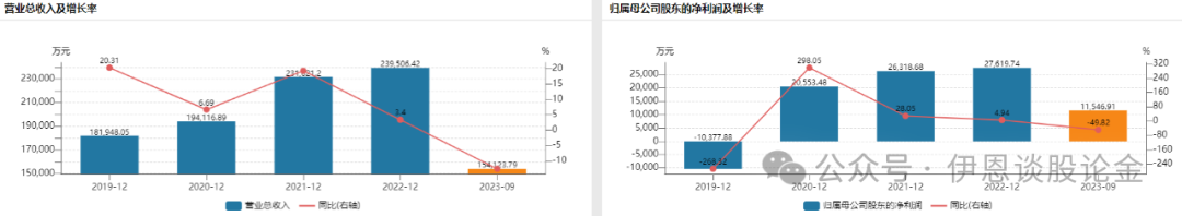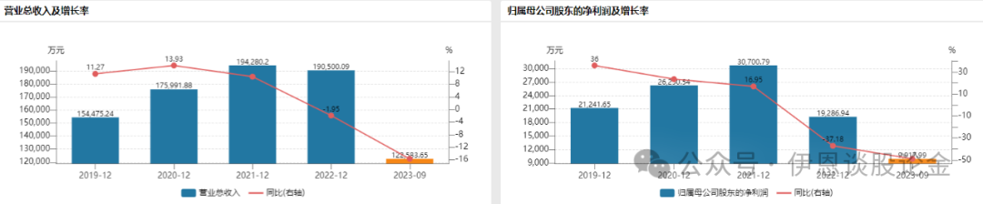 从业绩表现上来看,2019-2021年营收、净利润持续双增长,2022年增速转负。公司发布2023年业绩预告,净利润预计同比下降41%-56%。