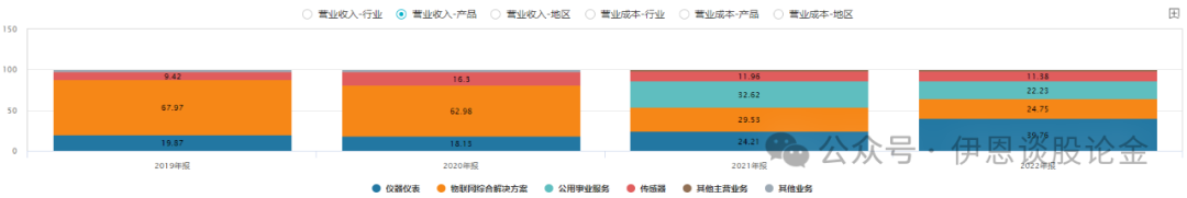 公司为国内知名的气体传感器及仪表制造商、物联网解决方案提供商,构建了相对完整的物联网 生态圈,主要是以传感器为核心,将传感技术、智能仪表技术、数据采集技术、地理信息和云计算等物联网技术紧密结合,形成了“传感器+监测终端+数据采集+空间信息技术+云应用+AI”的系统解决方案,业务应用覆盖传感器、智能仪表、物联网综合解决方案、 用事业及居家智能与健康等行业领域。公司传感器品类丰富,聚焦核心技术攻关和战略需求导向,积极推进产品市场导入和重点客户的深入布局,子公司与机器人企业积极开展柔性微纳传感技术业务合作。从产品结构上来看,2022年贡献收入占比依次是仪器仪表(39.76%)、物联网综合解决方案(24.75%)、公用事业服务(22.23%)、传感器(11.38%)。传感器业务占收入比长期稳定在11%左右。